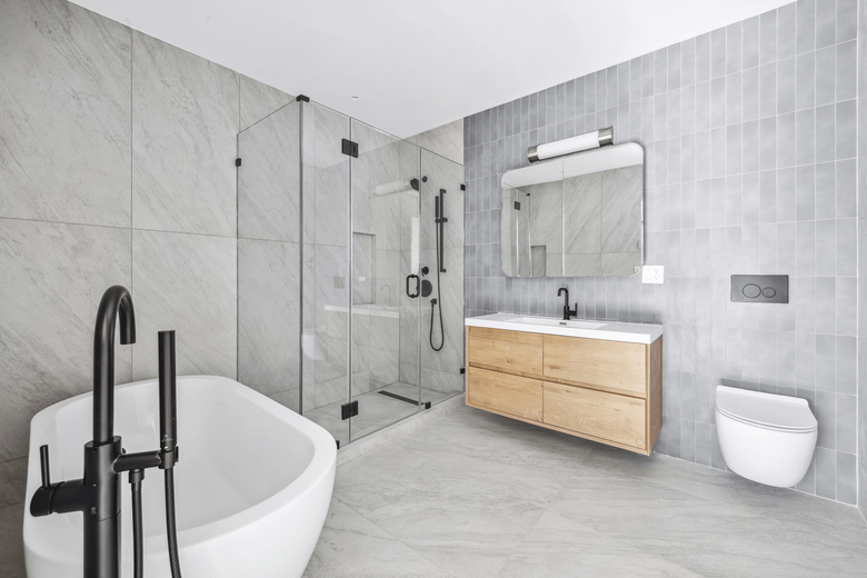 The primary bedroom is a spacious retreat that accommodates a king-sized bed set. The en-suite bathroom features a large freestanding tub, matte tiles with a bold bluestone accent wall, a walk-in glass shower, and an elegant wooden vanity. The off-suite bathroom is equally impressive, offering a deep soaking tub, extra storage, and a discreet washer/dryer. Both bathrooms boast heated floors, enhancing the comfort and luxury of your home.