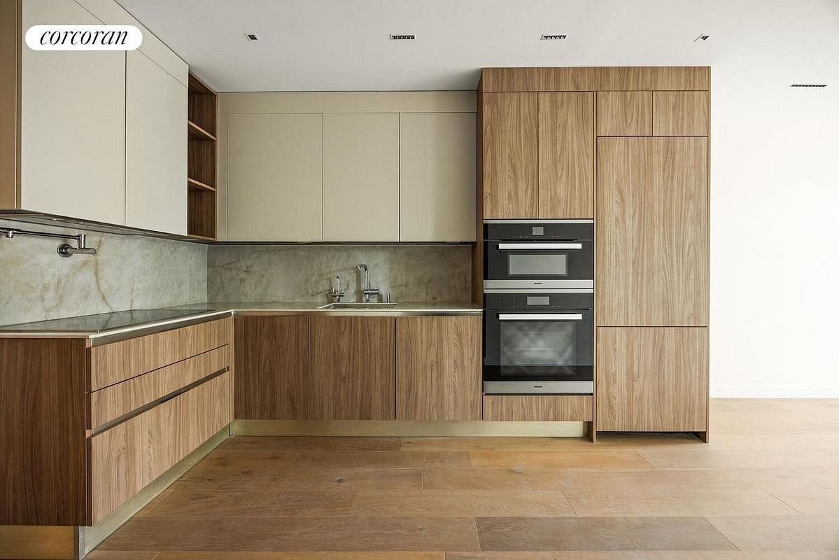The sleek kitchen blends matte and wood cabinetry with a striking stone backsplash and countertop, integrated appliances, and a streamlined cooking setup. Its thoughtful design maintains clean sightlines while offering ample storage and functionality for both everyday meals and effortless entertaining.