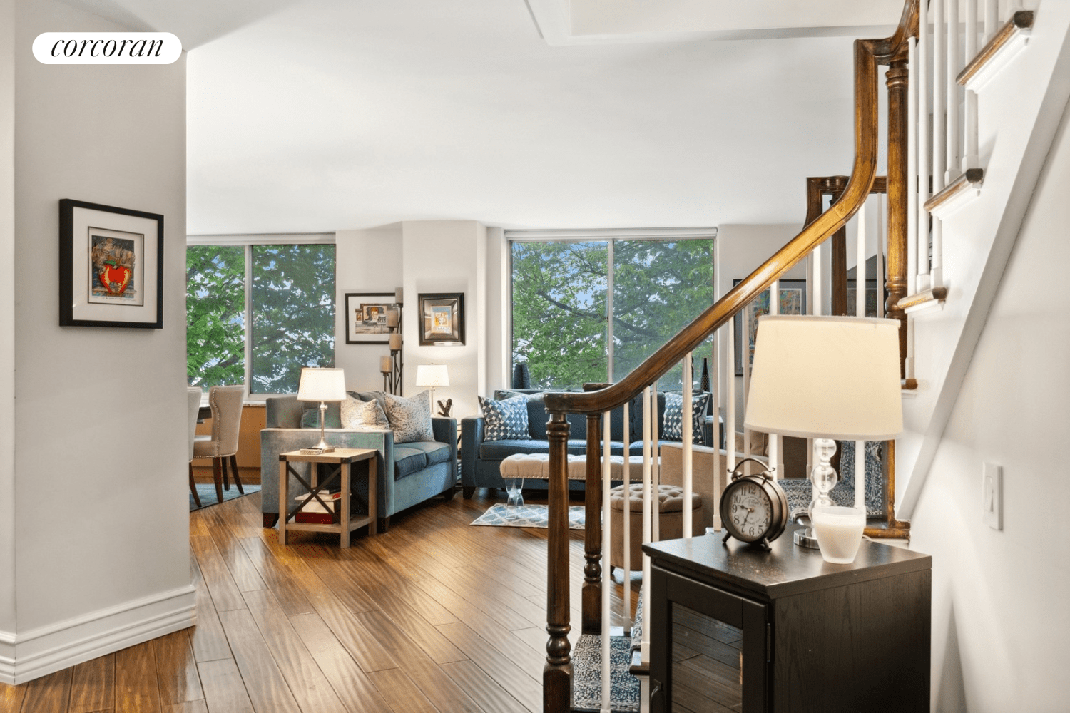 Mosey on up a beautiful, well appointed, staircase to the two oversized bedrooms. The southwest, corner, primary bedroom is extremely private and very spacious at over 14ft in both length and width while offering both river and park views. The newly renovated, en suite, primary bathroom is outfitted with a dual vanity, rain shower and marble tiles. The western facing, second bedroom, also has river and park views, a double door closet and extremely quiet. Also on the upper level is a second full bathroom, washer/dryer and an alcove perfect for a home office or Peloton or should direct access to the 3rd floor corridor be needed.