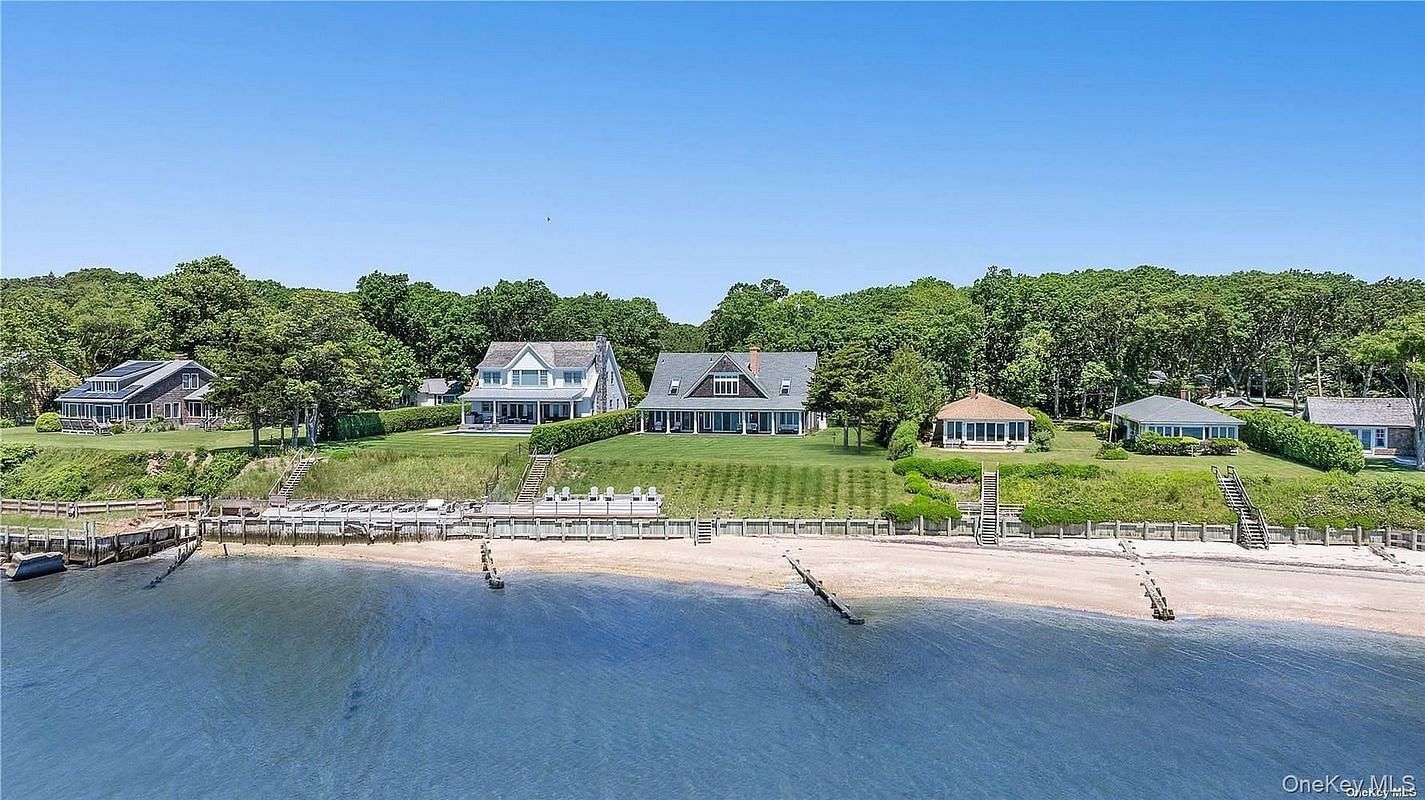 Welcome to a unique luxury waterfront estate, perfectly situated overlooking the Peconic Bay, with stunning views of Robin's Island and the Hamptons. With over 100 feet of sandy beach and surf, this custom-built residence features a guest house on the property, a lower-level waterside sun deck, and a covered mahogany porch. It's an ideal spot for early sunrises, enjoying the bay breeze, or admiring the beautifully landscaped lawn leading to the water's edge. The main house boasts premium finishes, fixtures, and detailed woodwork throughout. The open floor plan offers both elegance and comfort, flooded with natural light. New coffered ceilings, accented by reclaimed wood beams, provide architectural detail. The living room and formal dining room are anchored by a gas fireplace, which features built-in shelving and seating designed to maximize water views. The home is professionally decorated in a style that embodies a coastal lifestyle. The gourmet kitchen is equipped with high-end appliances, pearl white quartz countertops, custom cabinetry, a walk-in pantry, and a center island accented by a decorative reclaimed wood ceiling that defines the space. The main floor primary suite offers spectacular water views and private porch access. Its spa-inspired bathroom features double sinks, a soaking tub, and a beautifully tiled shower with bench seating. The suite also includes ample storage and a walk-in closet. Upstairs, you'll find two beautifully appointed bedrooms, a full bath, a bonus room, and two additional finished spaces suitable for storage or to be transformed into a gym, office, or recreation room. The guest house is also tastefully designed and well-equipped. It includes a retro eat-in kitchen, two charming bedrooms, a spacious living room with a wood-burning fireplace, quaint wood floors, a full bath, and on-site laundry. The outdoor bluestone patio is surrounded by lush greenery, creating a lovely ambiance for entertaining and al fresco dining. The property features mature, manicured landscaping and ample space for a water-facing pool or tennis court. Experience all that the North Fork and East End have to offer, conveniently located near the charming Love Lane, known for its delightful shopping and restaurant options, vineyards, and farm stands.