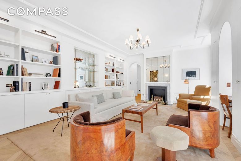 Upon arrival through restored French double doors, the formal entry hall leads to the living room. Natural light spills in from oversized southern windows drawing your eyes to the decorative Arabescato marble fireplace. A hidden TV cabinet has cleverlybeen designed behind folding mirrors. The room is finished with custom bookcases and discrete storage, and a built-in oak desk that sits beneath one of the Ansonias iconic elliptical windows. A concealed powder room in the wall features a marble checkerboard floor and marble sink with brass fixtures.