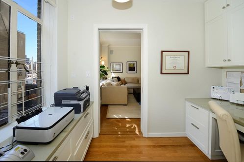Off a semi-private landing offering a sense of exclusivity and privacy, enter into a nearly 27-foot-long gallery. The formal living room is grand and regal, with a wood burning fireplace facing onto tree lined and tranquil 82nd Street. The room creates an inviting and open atmosphere for both relaxation and entertaining.