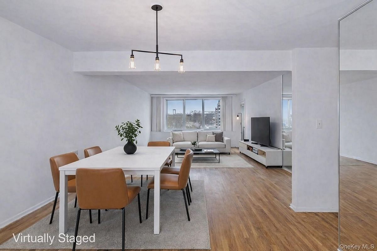 Welcome to this spacious top-floor 2-bedroom offering over 1,000 sq ft and a private blacony in a highly sought-after community. From the moment you enter the foyer, with its convenient half bathroom, you're greeted by hardwood floors and a long, flowing living and dining area that opens to a large private balcony with beautiful views of the Throgs Neck Bridge and partial views of Little Neck Bay. The layout includes a generous eat-in kitchen, ample closets throughout, and two very large bedrooms situated along a quiet back hallway, accompanied by a full bathroom. The building offers excellent amenities, including a private pool with membership included in the maintenance and excellent access to Bay Terrace Shopping Center. Monthly maintenance also covers all utilities and real estate taxes, providing exceptional value. Near to highways, Queens-Manhattan express buses and LIRR. A rare combination of space, views, and top-floor living. Seller is willing to offer a renovation credit.