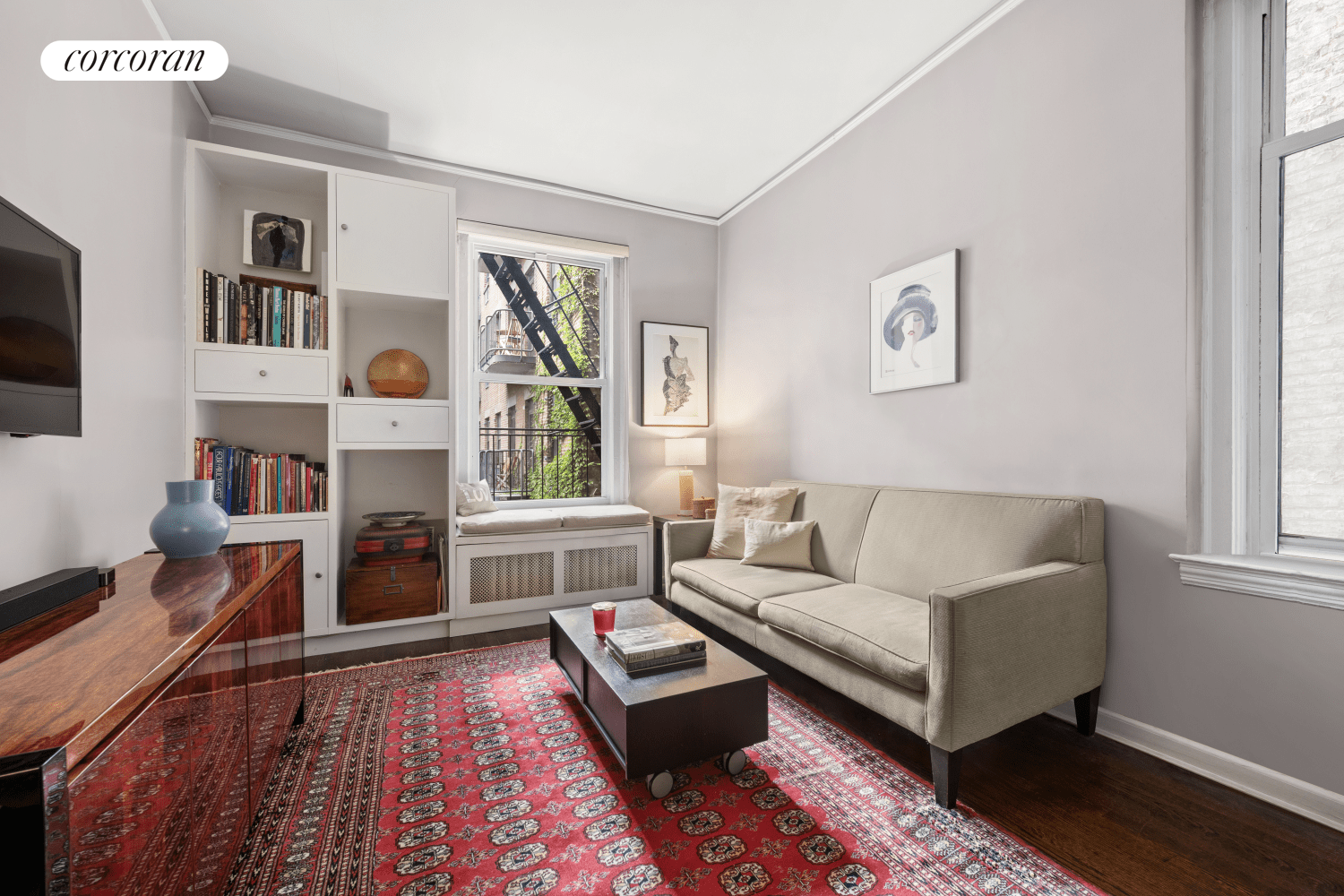 This perfectly laid-out apartment boasts nice high ceilings, a southern exposure, providing abundant afternoon light that enhances the inviting atmosphere. The living room includes a custom built-in bookshelf and window seat adding both functionality and charm to the space. The windowed kitchen offers plenty of storage and counter space with high-end stainless-steel appliances, including a Viking stove, and a breakfast bar that opens into the living area. The bedroom features a new expansive double window and a large closet, providing ample storage. To top it all off the apartment is super quiet making this home a true urban sanctuary.