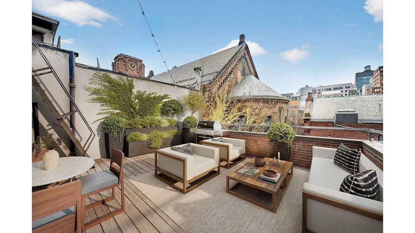 Inside, the owner's duplex unfolds with a sense of volume and warmth that feels almost European in spirit. A large south facing terrace becomes an extension of daily living, drenched in light and perfectly suited for long afternoons or evening gatherings. High ceilings, fireplaces, hardwood floors, and exposed brick create a layered texture throughout, while an expansive kitchen and exceptional closet space ground the home in everyday practicality. It is a residence that balances romance with function in equal measure.