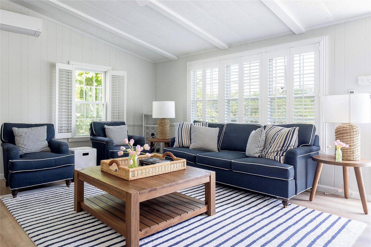 This sun-drenched corner-lot cottage offers the perfect Greenport retreat. The vaulted, open-concept layout creates a bright and airy living space, complemented by two generously sized bedrooms and a cozy, heated sunroom—ideal for year-round relaxation. Step outside to enjoy a beautifully landscaped patio, outdoor shower, and fully irrigated grounds surrounded by mature plantings. Just across the street from Sterling Harbor and under a mile to Kontokosta Vineyards, Greenport Village shops, restaurants, the Shelter Island Ferry, LIRR, and Jitney. A perfect blend of comfort, convenience, and North Fork charm.