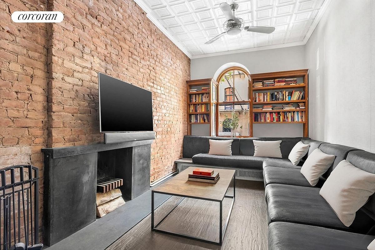 The inviting living area features exposed brick walls, a wood-burning marble fireplace, custom built-ins, and ornamental tin ceilings. A sleek stainless steel kitchen, outfitted with top-tier appliances (Miele, U-Line, Gaggenau, Dovedale, Sharp) and an Aquasansa water purifier, blends modern function with vintage character. One flight down, the bedroom suite offers custom closets, a built-in wrap-around desk, and a Miele washer/dryer. Comfort reigns with dual-zone A/C and heat (NewAir /Carrier) and radiant heated floors. The Japanese-inspired bath, a serene retreat, showcases a river-rock soaking tub with rainfall shower, Duravit and Watermark fixtures, and an Italian vessel sink. Additional highlights include a Sharp Aquos flatscreen, Bose surround sound, remote-controlled Matthews ceiling fan, and a custom Desiron stair railing.
