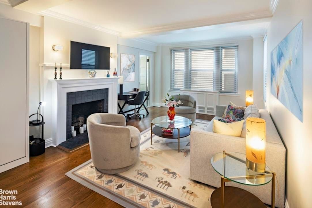 It has a gracious entry with a full walk-in closet and another spacious closet. A beautifully proportioned large live in area with a wood burning fireplace and a Murphy bed. Prewar features include hardwood floors and beamed ceiling. The windowed kitchen is unusually large with an open dining area, it has plenty of counter space, cabinetry, and top of the line appliances. An immaculate windowed bathroom completes this gem of an apartment.