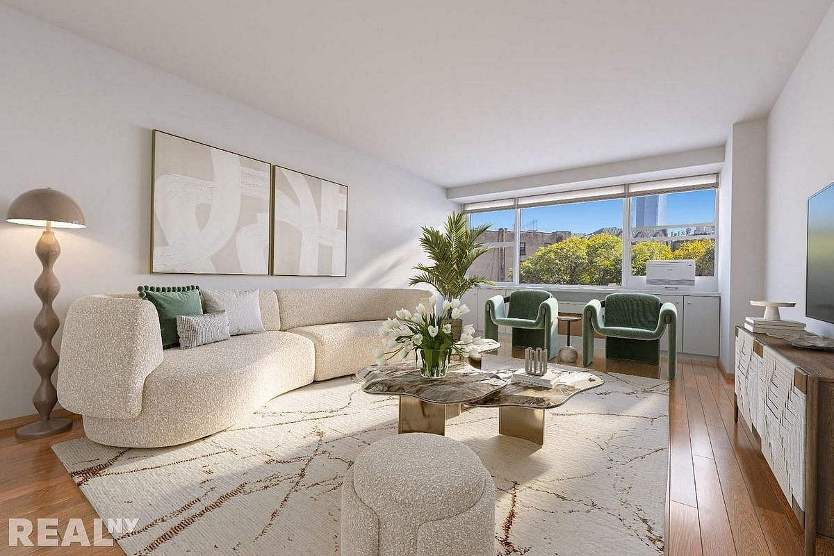 Situated on the 4th floor, #4B offers south eastern views. The king-sized bedroom apartment boasts ample closet space near the entryway + bathroom, while the west-facing kitchen, complete with a window, brings in plenty of natural lighta rare find in the city. This well-maintained apartment features stunning hardwood floors and a fresh new bathroom