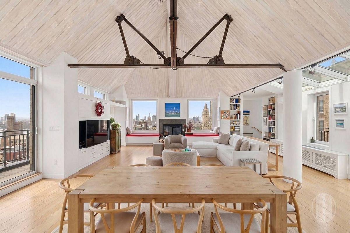 The penthouse is organized into two distinct private wings. The eastern wing is anchored by a serene primary suite with Central Park views, direct terrace access, a wood-burning fireplace, dual walk-in closets, and a spa-like en-suite bath with both a soaking tub and shower, each positioned to capture river views. Above, a skylit studio offers a private and inspiring workspace. Three additional bedrooms, two versatile loft spaces, and a dedicated laundry room complete this wing. In the western wing, a beautifully renovated loft bedroom features double-height windows with sweeping river views, a fully reimagined en-suite bath with radiant heated floors, walk-in closet, and a mezzanine loft ideal as a studio or library.
