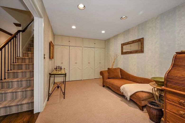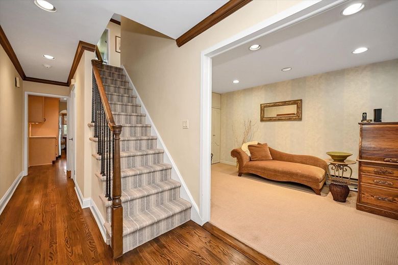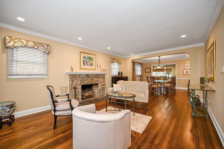 room with a cozy fireplace and a charming bay window that fills the space with natural light. The updated eat-in kitchen boasts stainless steel appliances, quartzite countertops, and an exquisite onyx stone backsplash, making it a chef’s delight. Adjacent to the kitchen, the cozy dining area that overlooks the backyard, creating a serene setting for meals. A spacious formal dining room leads into a large family room with direct backyard access, ideal for gatherings. Additionally, the first floor features a bonus room, perfect for extra living space and a convenient half bathroom with a stainglass window. The second floor landing is spacious and boast a colorful stainglass window letting in magnificent light . Second floor is home to a spacious primary suite with an en-suite bathroom and a walk-in closet. Two additional large bedrooms with ample closet space and natural light share a well-appointed Full huge bathroom with a tub/shower combo and double vanity.