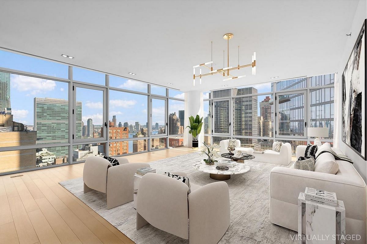 A seamless blend of modern sophistication and vibrant essence of Midtown, this expansive full-floor condominium offers 3 bedrooms, 3.5 bathrooms, and breathtaking views of the Manhattan skyline to East River. Floor-to-ceiling windows span the entirety of unit, bathing in northern, southern, and eastern light. Throughout the home, pristine white oak floors underscore its contemporary elegance and equipped with state-of-the-art Crestron home automation system that effortlessly controls motorized curtains, audio/visual systems, and central heating and cooling.