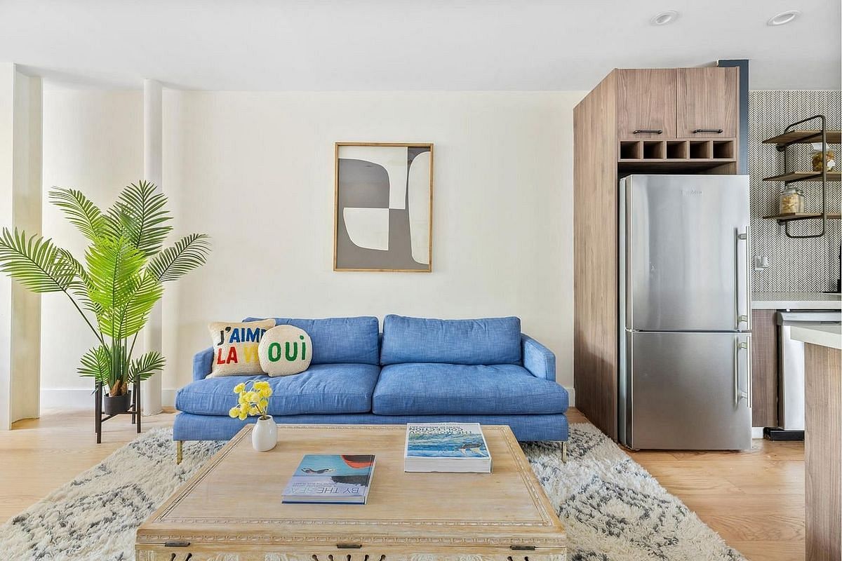 The open kitchen layout features granite countertops and a generous island that offers both extra storage and workspace. It comes fully equipped with a GE microwave and range, a Blomberg stainless steel refrigerator, and a Danze faucet. The bathrooms are designed with comfort and style in mind, including SunTouch radiant heated floors, spa-like chrome fixtures, and LED lighting throughout. A shared laundry room is conveniently located in the building's cellar level.