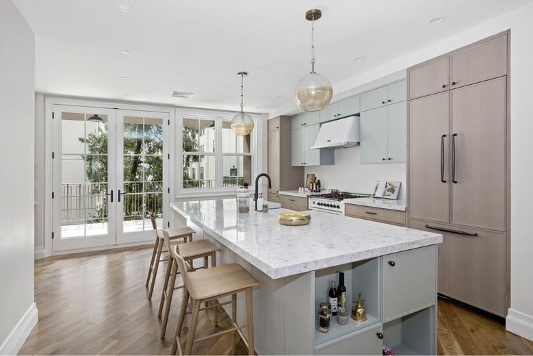 Unit 1 is a sprawling 1,997 square foot, three-bedroom triplex featuring a tranquil private garden, an additional terrace, and a spacious cellar. The living space has a generously appointed layout, large arched sun-drenched Kolbe windows, and thoughtfully designed finishes. The spacious bright living room with fireplace unfolds into an expansive dining area and then opens on to the designer kitchen, with honed Agglo Doge terrazzo marble countertops and custom cabinets from German Kitchen Center. A deep farmer's sink is located on the oversized central island. A wet-bar sink is conveniently located next to the built-in Smeg coffee maker and XO Wine Cooler. Appliances include a Bosch smart refrigerator & dishwasher complimented by the ivory Ilve freestanding oven & hood range. Double doors from the kitchen lead to the oversized covered terrace overlooking the private garden. No attention to detail was overlooked in the primary bedroom. A wall of closets features a custom-built niche for a vanity or media center. The sizable layout leaves ample space for a variety of furniture configurations and features a generous en-suite bath. The primary bathroom in this home is spa-like, featuring beautiful Thassos mosaic flooring and designer light fixtures. This home has three full baths plus a powder room on the living room level.