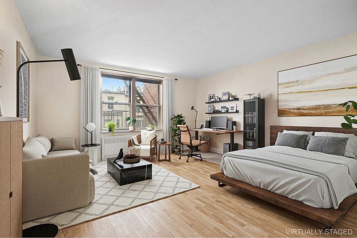 Bathed in south-facing natural light, the residence offers serene, open views of classic brownstones and the historic streetscape that defines Park Slope living. Thoughtful updates throughout elevate the space, including refinished original hardwood floors that preserve the home's character, a renovated kitchen with updated appliances and sleek finishes, and a modern, stylishly upgraded bathroom. Custom blackout shades add a layer of comfort and privacy, perfect for both restful mornings and cozy evenings.