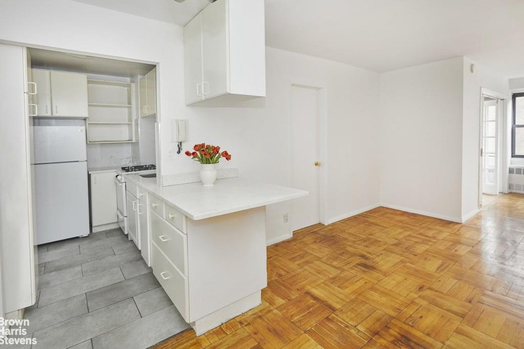 Artfully crafted from a former studio space, the addition of French doors separates the living area from the bedroom. The north-facing orientation floods the space with natural light, highlighting an entire wall of windows. Efficiency meets style with a designated corner ideal for a home-office setup, offering a productive space for remote work. Three deep closets provide ample room for belongings. In addition, the kitchen has been expanded, adding more storage space and a countertop for casual eating or morning coffee. Located in a full-service cooperative with a 24 hour doorman and a live-in superintendent. There is a laundry facility, a furnished roof-deck, private storage units and the garage next door offers special rate for shareholders. 75% financing, Pied-a-terre and dogs under 25lbs allowed. There is an assessment of $97.50.