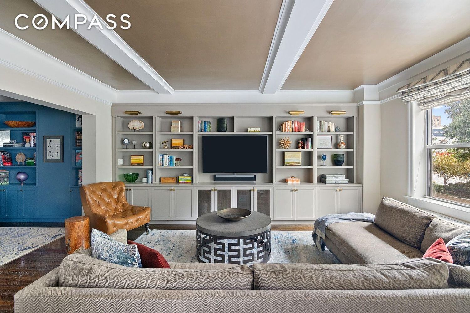 Step into the expansive living area and be greeted by high, coffered ceilings, custom built ins, and beautiful hardwood floors. Oversized windows with custom treatments allow for plenty of natural sunlight, creating a bright and inviting ambiance. The library/den offers a tranquil space for reading or working from home.