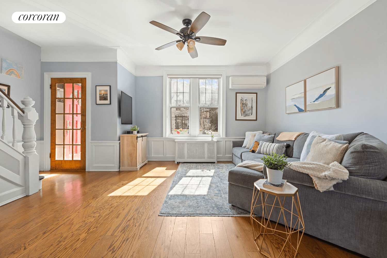 Upon entering the parlor level, you're greeted by a sun-filled, south-facing living room that seamlessly flows into the dining area and newly updated kitchen, complete with stainless steel appliances, stone countertops, and custom cabinetry. This level also features a split-unit AC system to cool the entire floor and a convenient powder room at the back of the house. Off the kitchen, a door opens to a spacious backyard, ideal for unwinding or entertaining guests.