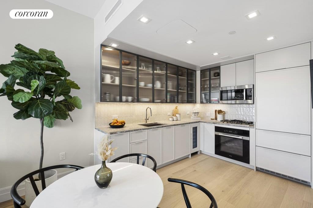 This well-appointed corner exposure 706SF one bedroom one bath home has stunning views of the World Trade Center and downtown skyline, framed by floor-to-ceiling windows.7-inch-wide plank white oak flooring runs throughout the residence. The well-planned L-shaped kitchen is outfitted with top-of-the-line Miele, Bosch and Subzero appliances, Zellige tile back splash and