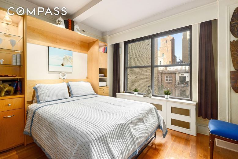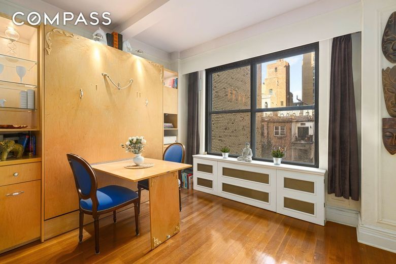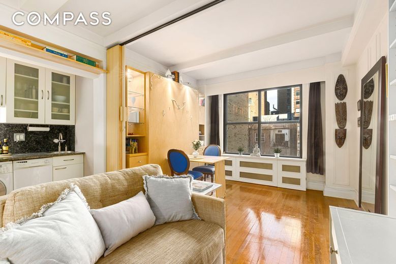 Superb Central Park West location with Central Park across the street. Imagine a studio intelligently designed in move-in condition with all the creature comforts you crave: numerous built-ins with abundant storage, a fully outfitted walk-in closet, your own in-unit all in one WASHER/DRYER, kitchen with granite countertops, a gas range and a dishwasher. The Murphy bed is a pleasure to use and when the bed is stowed away, there is a built-in dining table to enjoy meals. Filled with pre-war details this home has 9-foot high beamed ceilings, enormous windows, moldings and hardwood floors. An added bonus is the retractable room divider that creates a separate bedroom. Pieds-a-terre case by case. Pets are welcome with co-op board approval. 60% financing is allowed.