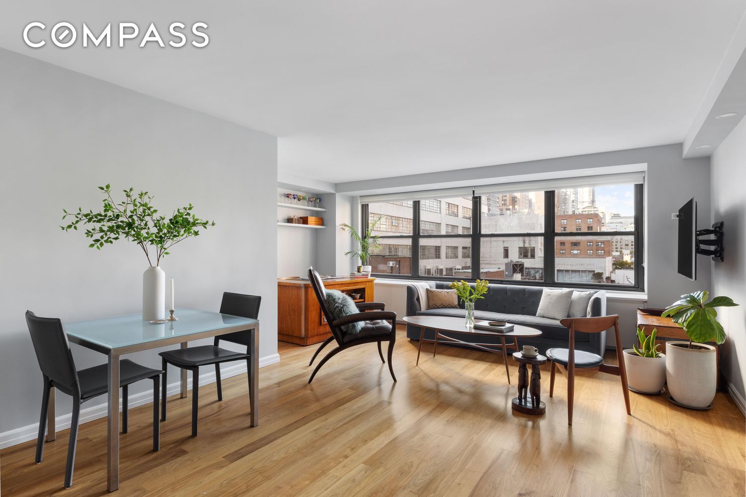 Come home to a beautiful, turnkey 1 BR/ 1 BA with a flex home office/ dining area and unobstructed, open city views in a full-service co-op where the maintenance includes utilities, electric, and A/C!