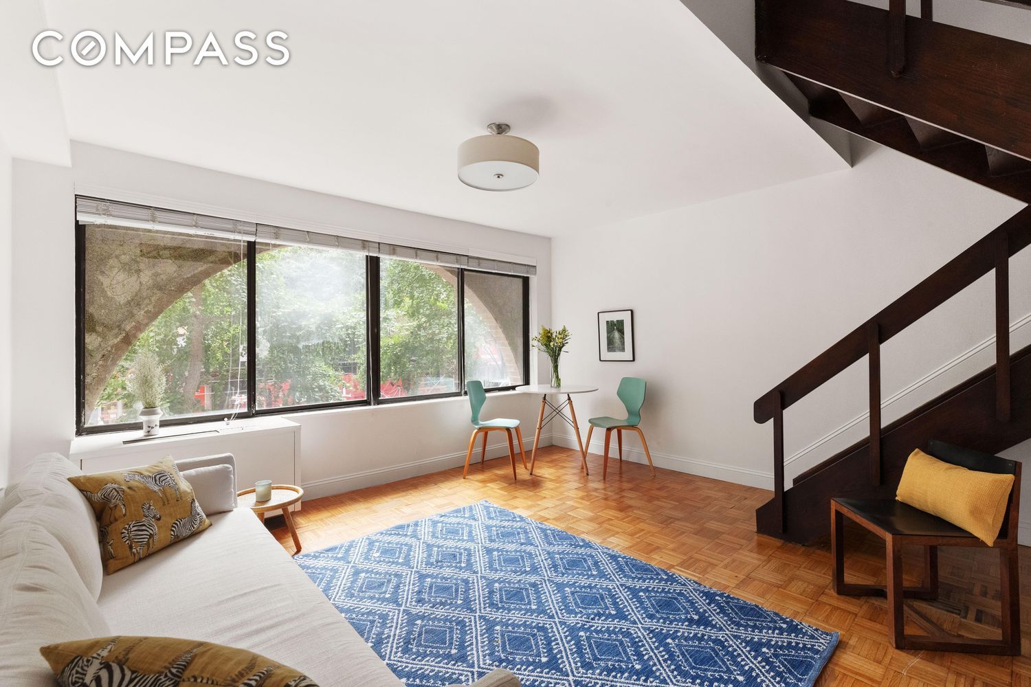 Located in the heart of Yorkville, this 1 bedroom, 1 bathroom contemporary triplex has open south facing streetscape views, up to 16+ foot ceilings, and a minimalist staircase connecting all three levels. The living room features a dramatic 12 foot long arched window, south facing treetop views, and a built in bookcase and storage. The airy bedroom has another oversized south facing window, a wall of closets, and sliding frosted panels for additional privacy. The open renovated kitchen features stainless steel appliances and rich cabinetry. The tastefully renovated bathroom features a rain shower. And the oversized foyer can serve as a dining or office area.
