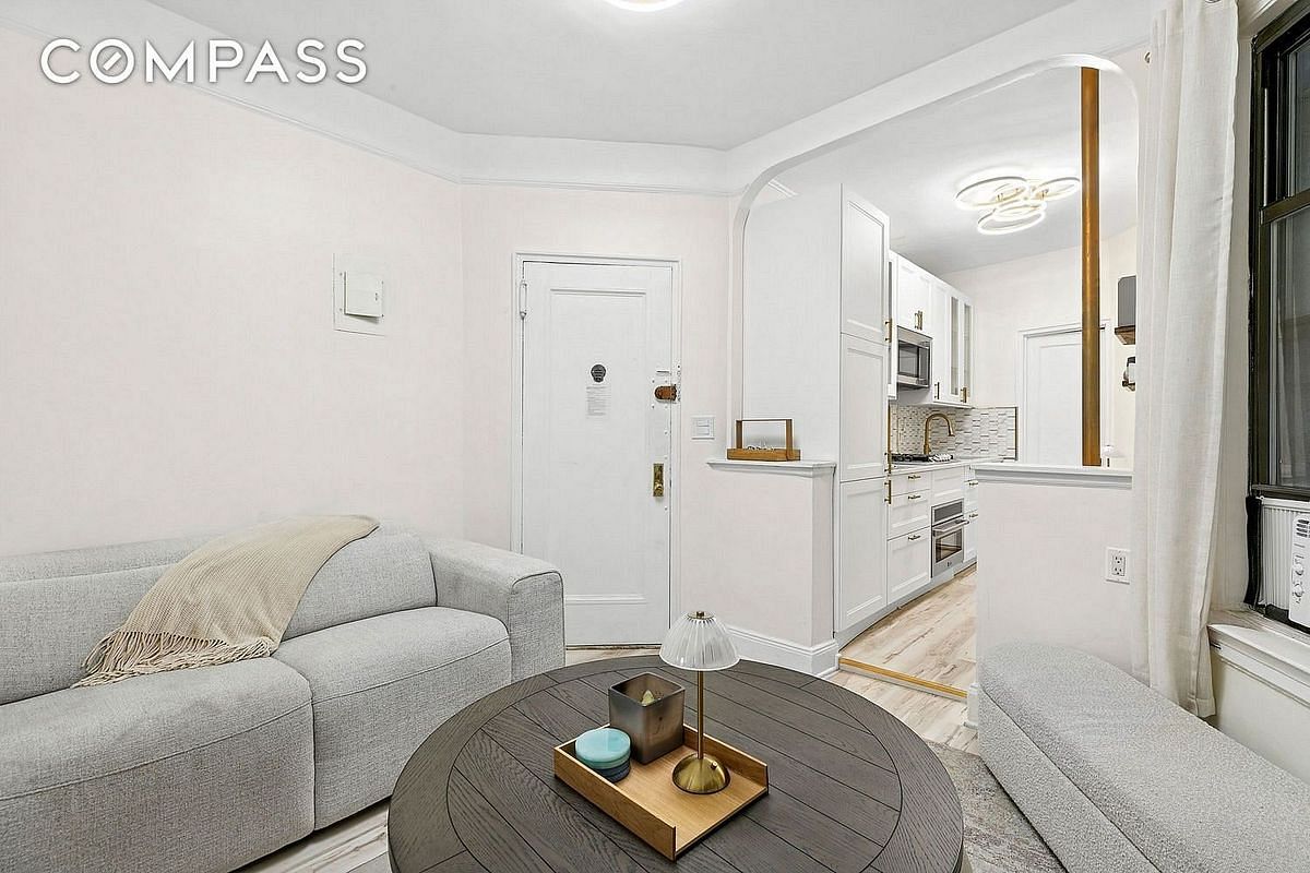 This bright and inviting home is an easy third-floor walk-up, offering a quiet, elevated retreat above the trees. The apartment has undergone a thorough renovation, featuring a brand-new kitchen with sleek custom cabinetry and an integrated refrigerator, perfectly designed for modern living. The open layout flows seamlessly for both everyday life and entertaining, with large windows that fill the space with natural light.