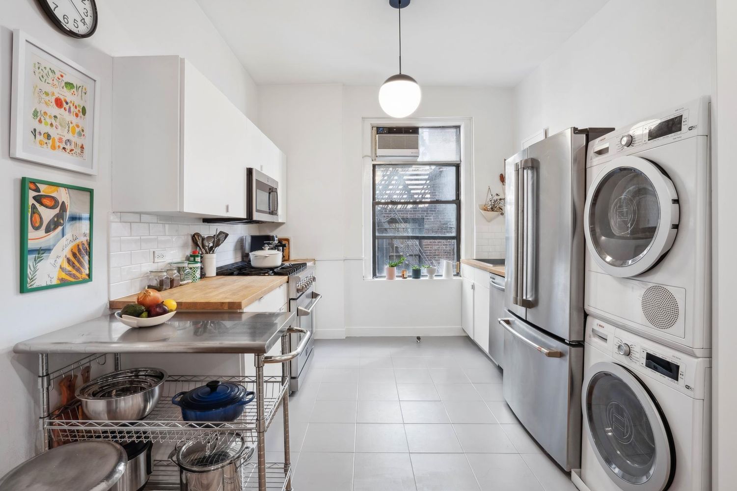 This lofty two bedroom home was lovingly renovated by its current owners to create a perfect balance of form, pre war details and function. Hardwood floors, soaring ceilings (almost 10 feet), oversized windows, and brick walls are matched with clean lines and modern finishes--including robust storage.