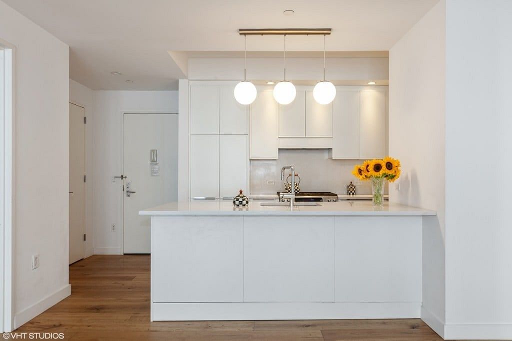 This bright apartment with floor to ceiling windows is facing North and overlooks a beautifully planted and furnished 5,800 sq. ft. landscaped courtyard and features in-unit washer/dryer, high quality finishes, gorgeous wide-plank white oak floors, state of the art open chefs kitchen with stainless steel appliances, marble-look Caesar-stone counters and elegant cabinetry.