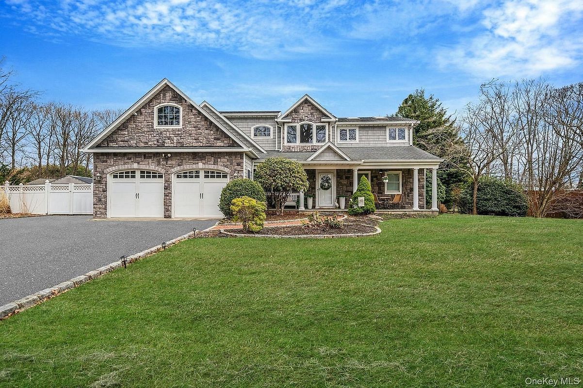 Welcome to this lovely Post Modern Cape set on just under half an acre of beautifully maintained property. Designed with both comfort and entertaining in mind, the open-concept main level features a spacious eat-in kitchen with a striking two-level center island, seamlessly flowing into a formal dining room and an expansive living room. The living area impresses with vaulted ceilings, exposed wood beams, hi-hats, and a stunning stone wood-burning fireplace, while French doors lead out to a backyard oasis.