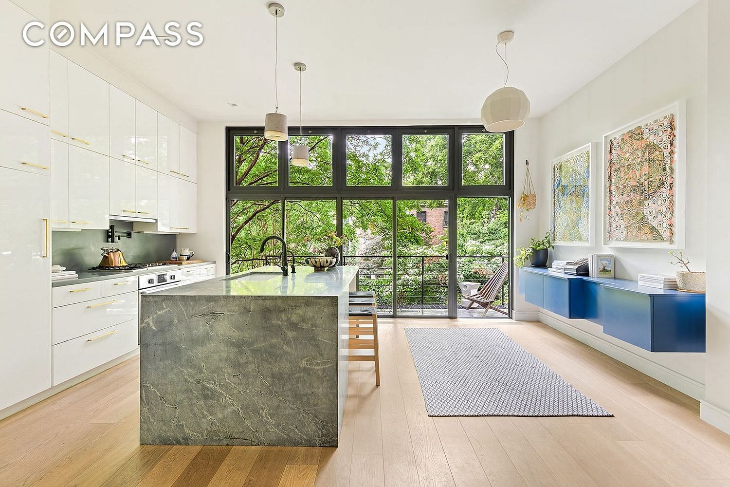 Thoughtfully redesigned with both style and functionality in mind, the owners triplex offers a seamless blend of open-concept living and a private retreat. The parlour floor is an entertainers dream with an expansive, sun-drenched open layout. The kitchen is gorgeous, with an oversized quartzite island, custom cabinetry, a walk-in pantry, suite of top of the line appliances, and double dishwashers and sinks. Large sliding glass doors fill the space with light and open directly to a lovely deck and a lush backyard oasis. With plenty of room for a grilling station and sizable lounge furniture, the tranquil garden is your personal escape in the heart of Brooklyn.