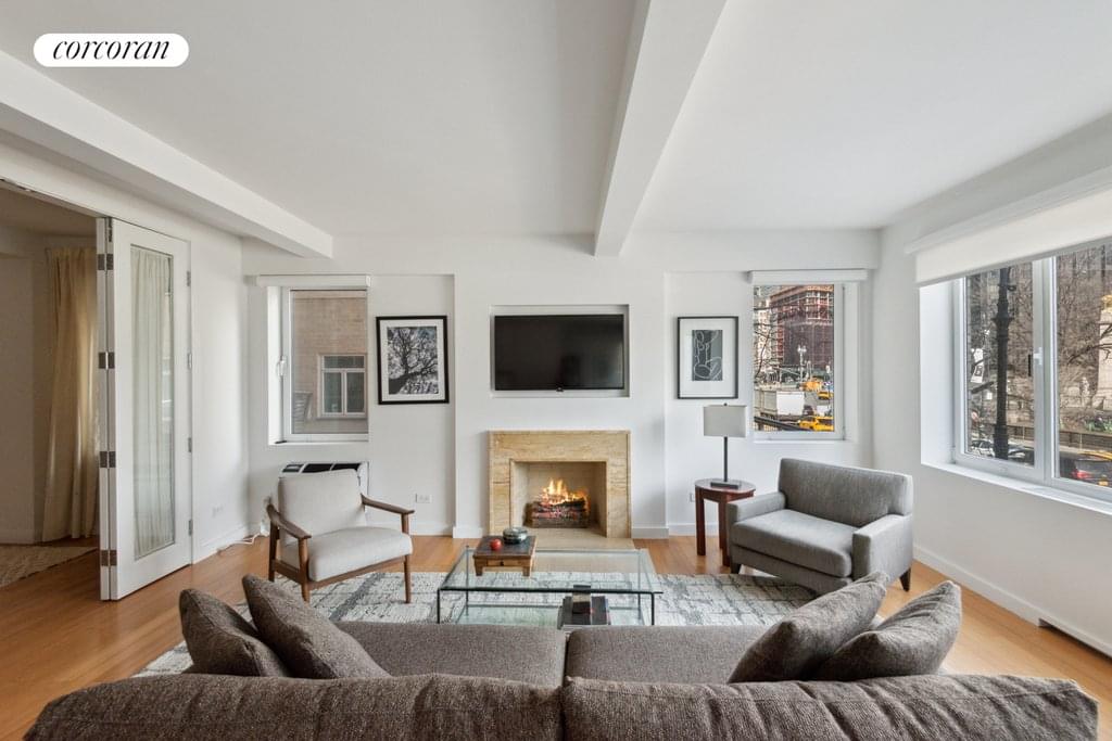 Enjoy watching the seasons change in Central Park from this meticulously renovated, gorgeous two bedroom, two bath apartment with three exposures. The direct views of Central Park and Columbus Circle from walls of windows in the spacious great room bring in stunning light and iconic city and park scenery. The oversized living room features high ceilings, a separate dining area, travertine decorative fireplace, wide plank bamboo floors, built-in television, and multiple exposures throughout.