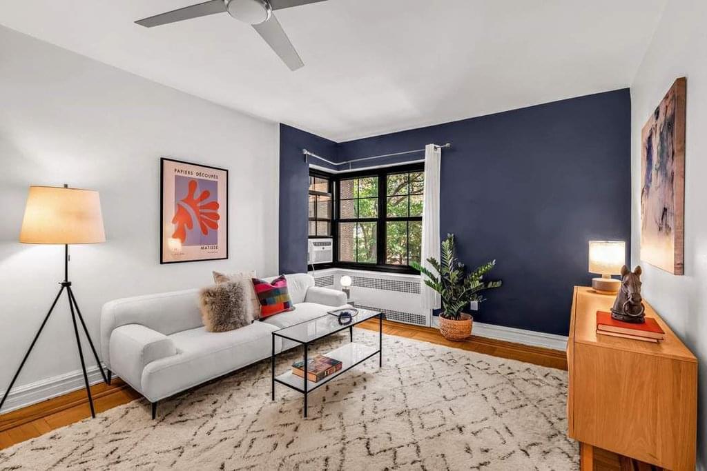 The pre-war scale of the unit is apparent immediately. The entrance foyer opens up to the sunken living room providing for extra high ceilings, and the corner picture windows featuring northern and western exposure give the whole apartment a light and airy feel. It also overlooks the buildings charming entrance gardens for a lush green view. A modern queen-sized murphy bed is tucked away in the sleeping area and is encased within a sleek built-in with recessed lighting.