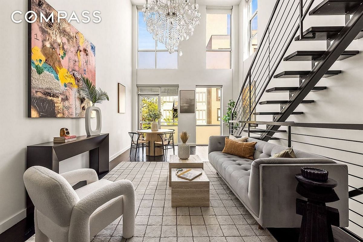 Upon entering, you'll be immediately impressed by soaring 19-foot ceilings and a striking wall of East-facing windows, drenching the spacious living room in natural light. The ebony-stained hardwood floors throughout create an elegant, cohesive flow from room to room. The open kitchen is a chef's dream, with stainless steel appliances, a subway-tiled backsplash, butcher block countertops, and a convenient breakfast bar ideal for casual meals or socializing with friends.