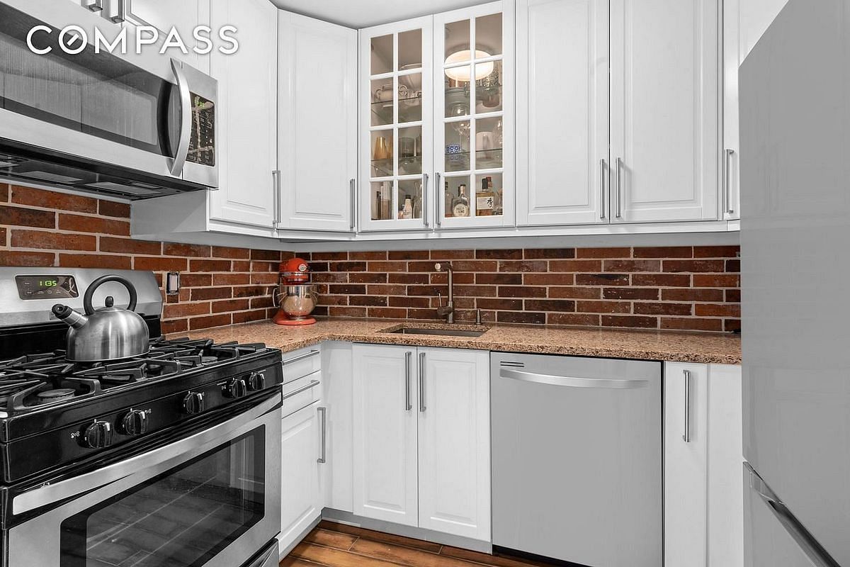 The main level opens into a bright, airy living and dining space where hardwood floors and generous ceiling height create an immediate sense of openness. The kitchen is both stylish and functional, featuring crisp white cabinetry, a warm brick backsplash, granite countertops, and stainless-steel appliances an effortless setting for both everyday living and easy entertaining.