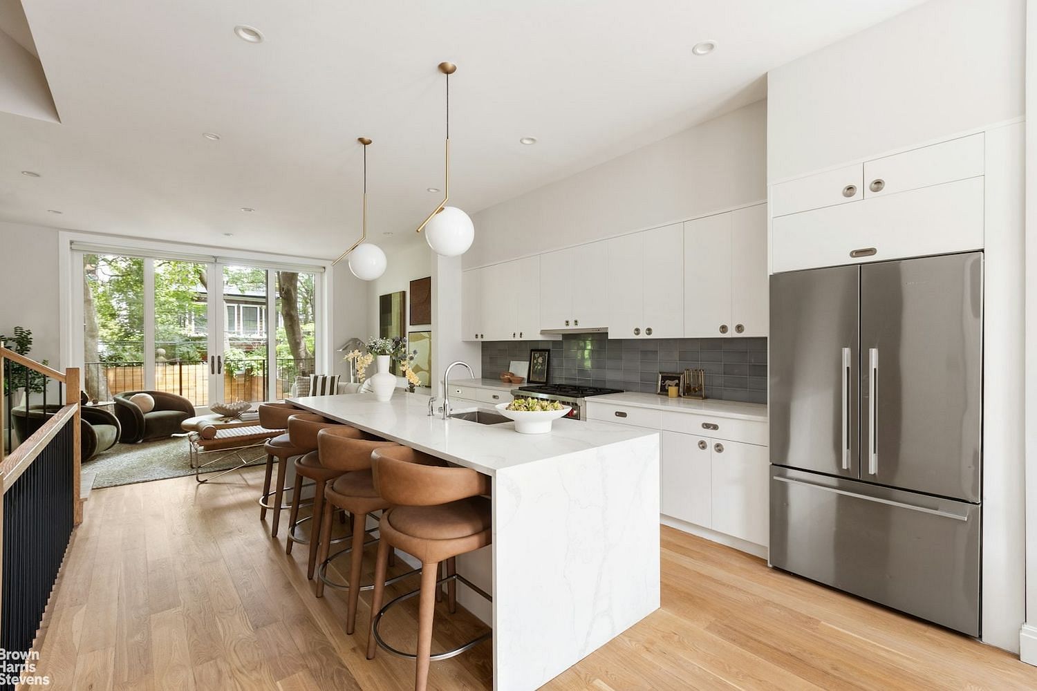The elegant parlor floor welcomes you into a grand living and dining space with soaring ceilings, setting the stage for both cozy nights and stylish entertaining. At the rear of the home, a chef's kitchen equipped for serious culinary endeavors opens seamlessly onto a private deck overlooking a lush back garden-an idyllic spot for alfresco dinners or morning coffee.