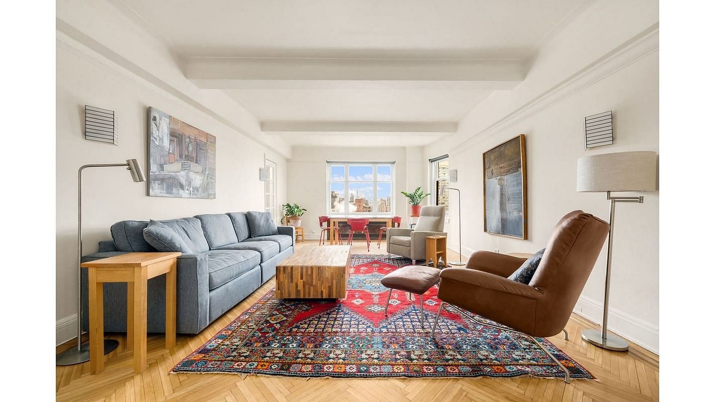 Residence 19C is a beautifully proportioned two-bedroom, two-bath home with triple exposures to the north, south, and west, filling the apartment with exceptional natural light throughout the day. The expansive living and dining room features classic pre-war ceiling beams, hardwood floors, and oversized windows framing sweeping skyline and river views.