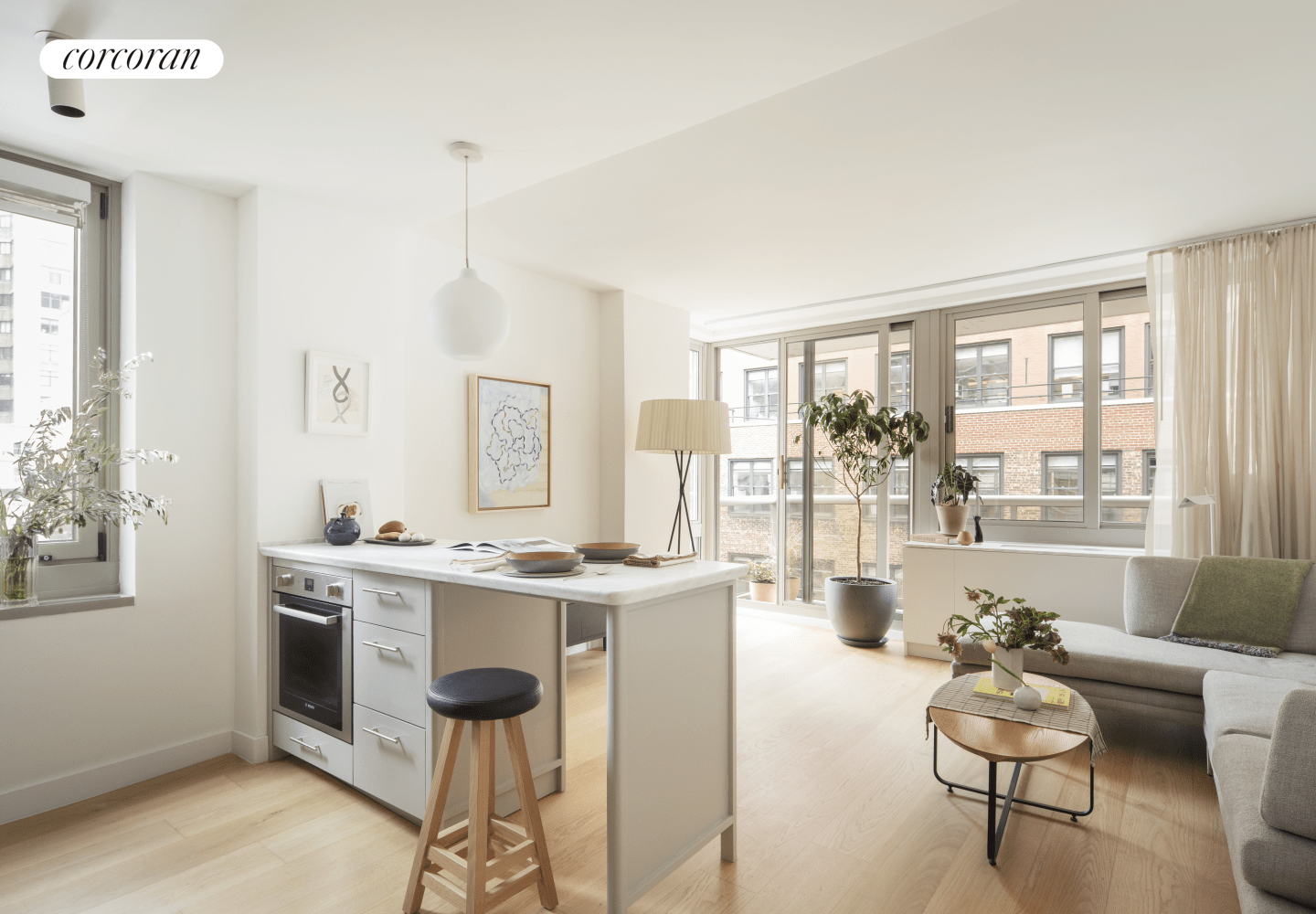 Wide-plank white oak flooring, large-scale windows and glass doors, and a serene marble bath create a calm, cohesive interior palette. With an in-home Bosch washer/dryer, the layout prioritizes real livability.