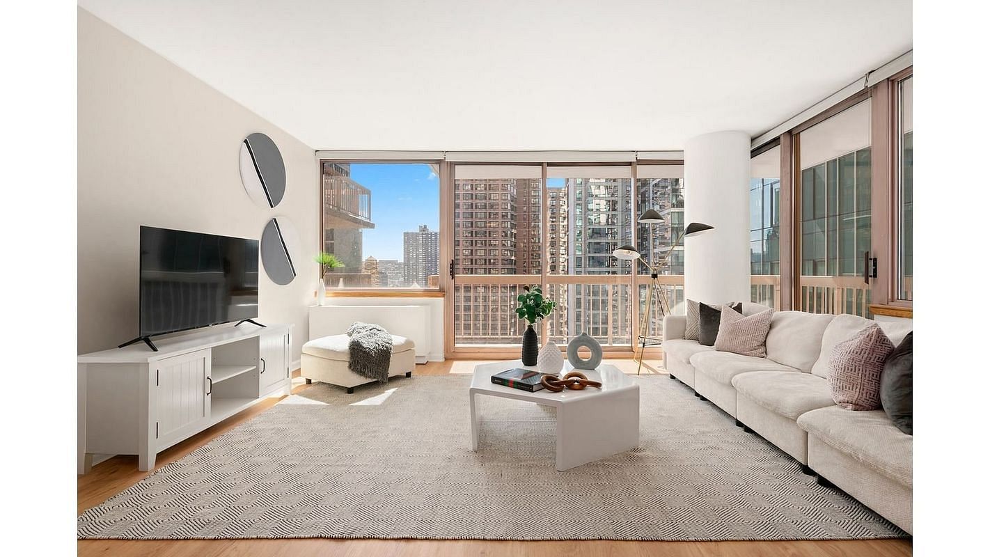 Awash in sunlight, this 15th floor south-facing one bedroom with one-and-a-half baths features a gracious entrance foyer preceding a large, south-west corner-exposure living room with floor-to-ceiling glass and a private 84 square foot wrap-balcony. The living room is approx. 16.5 feet wide by over 20 feet in length with a spacious dining area, an area for a home office and two pairs of sliding glass doors providing access to the balcony.