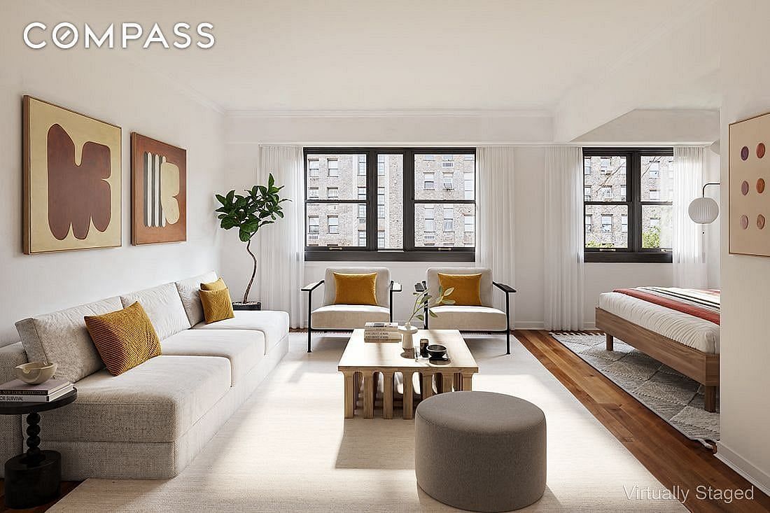 Apartment 8E at The Plymouth House welcomes you with a large, light-filled great room framed by a full wall of open northern exposures. The expansive layout easily accommodates both comfortable living and generous dining or entertaining areas, all bathed in steady natural light throughout the day.