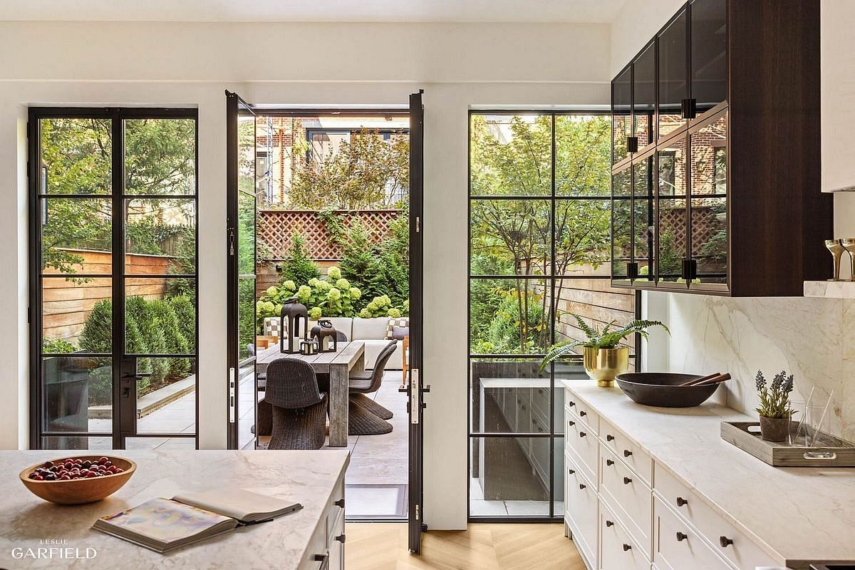 The parlor floor embodies elegance with chevron laid rift and quartered white oak floors, bespoke millwork, and oversized windows with Juliet balconies. A formal dining room and a 25 foot deep rear salon with gas fireplace create an ideal setting for entertaining, framed by lush garden views.
