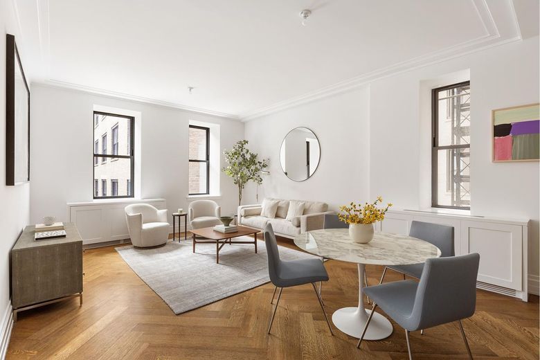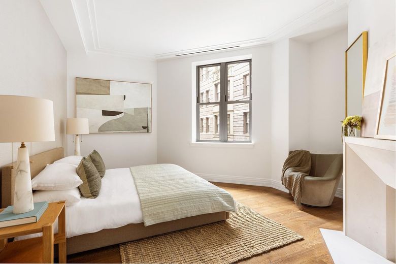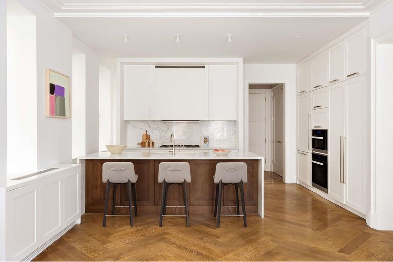 This elegant 1,830 Sq Ft three bedroom, two-and-a-half-bathroom residence continues the blend of old-world charm and modern living. Refined details of its pre-war design include a wood-burning fireplace, high ceilings, and decorative moldings. A formal foyer opens into the open living and dining area. The thoughtfully designed kitchen features white lacquer and stained oak cabinetry, complemented by Calacatta Gold countertops and backsplash. An integrated suite of top-of-the-line appliances by Gaggenau, Miele and Sub-Zero complete the kitchen.