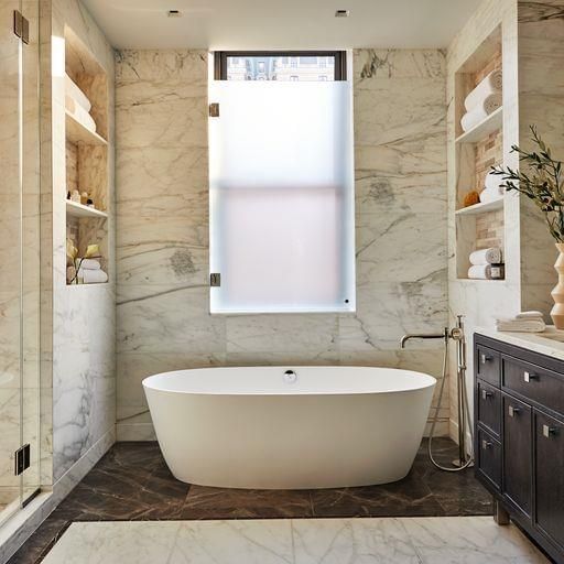 A spacious gallery leads to the primary bedroom. The serene escape has a wood-burning fireplace and a walk-in closet leading to the primary bath. Finishes are a refined composition of Calacatta Gold, Nero Gold, and Tundra Grey marble tile with accents and a feature wall of Haisa marble mosaics, Custom cerused and grey stained white-oak vanity millwork with Calacatta Gold countertop, double vanity sink with Lefroy Brooks hardware, radiant heated floors, and a freestanding tub and an oversized shower enclosed with frameless glass doors.