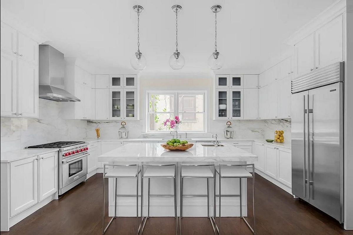 High ceilings, grand proportions and glorious light abound. The living room features a gas fireplace and a large central palladium window with Juliet balconies on each side. The huge custom Spazzi eat-in kitchen is perfect for even the most discerning chef and features an oversized single slab Calcutta gold marble island and top-of-the-line appliances by Subzero, Wolf and Bosch. A well-appointed powder room and large entry closet complete the main floor.