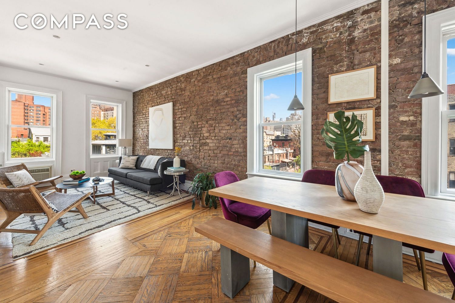 The windowed kitchen includes a bar area with exposed brick and beautiful views. The renovated windowed bathroom includes a walk-in shower. 5C comes with a dedicated storage unit.