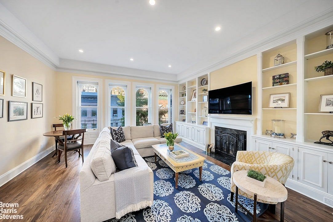 This absolutely beautiful floor-through home is located on the top floor of a classic New York City brownstone. No expense was spared to create this wonderful oasis with its own private roof top terrace. As you enter the apartment you are drawn to the beautiful arched windows in the living room which overlook this idyllic tree-lined block just off Central Park. The generously proportioned room also boast a working wood burning fireplace, high ceiling custom shelving and cabinetry, a cleverly disguised large closet and stairs to your private rooftop oasis.