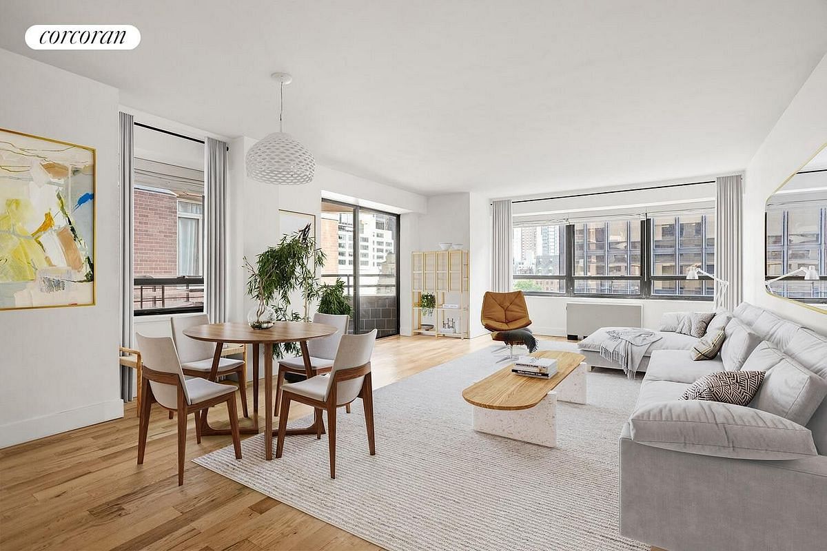 Inside, the gracious living room is filled with natural light from oversized windows and features open city views. The layout provides plenty of space for both comfortable living and dining.