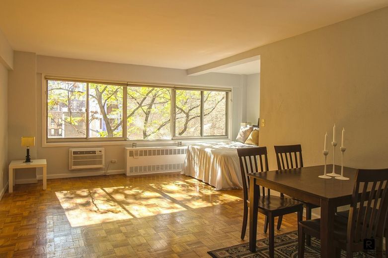18 feet of windows facing south to quiet courtyard gardens! Lots of sunlight, tree and city views. Spacious alcove studio with updated kitchen and bath. The kitchen in the B-line apartments is often expanded with an island and additional cabinets (see photo and alternative floor plan attached).