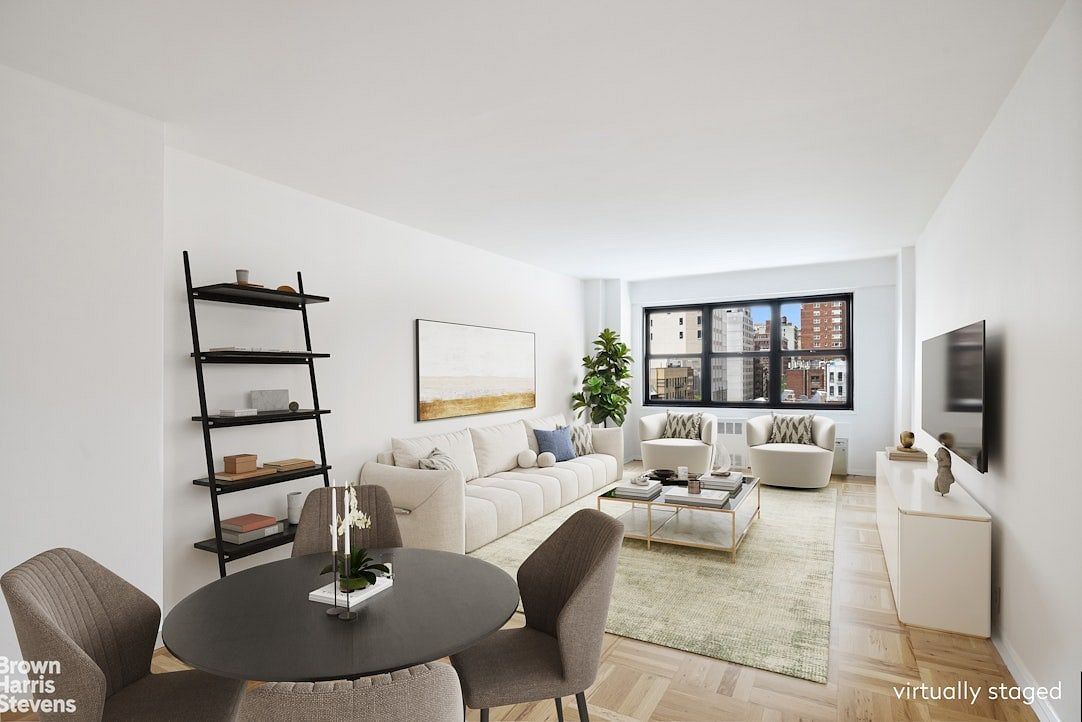 This pet-friendly condop welcomes dogs up to 20 lbs and offers a rare level of flexibility with unlimited subletting after one year of ownership, no board interview, and the option for pied-a-terres and co-purchasing, all with board approval. Residents enjoy the convenience of a 24-hour attended lobby, live-in superintendent, and full staff. Building features include four elevators, a landscaped roof deck, laundry room, storage cages and bike storage, and on-site parking garage.