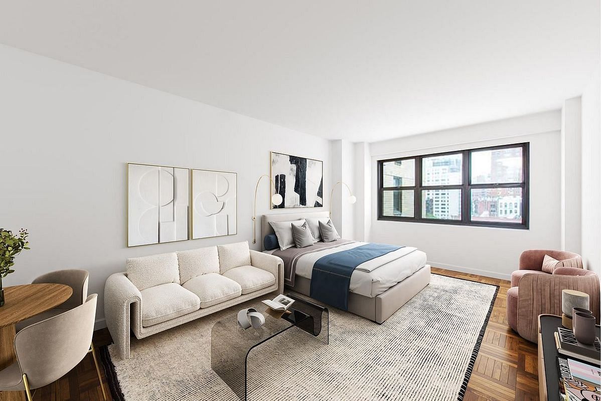 Introducing a stunning studio located at The Eastmore, one of the most sought-after buildings on the Upper East Side. This meticulously renovated unit features top-of-the-line finishes and oversized west-facing windows that provide breathtaking open views of Manhattan. The studio includes an open kitchen with a granite island, equipped with high-end Bosch appliances, ample counter and storage space, a Sub-Zero refrigerator, and a wine cooler. and two spacious closets. The building offers a range of amenities, including a beautifully landscaped roof deck, an updated laundry facility, and garage access. Conveniently situated near D'Agostino's, Citarella, Gristedes, and various health clubs, residents will also enjoy a quick walk to the Q train on Lexington Avenue. Unit is virtually staged.